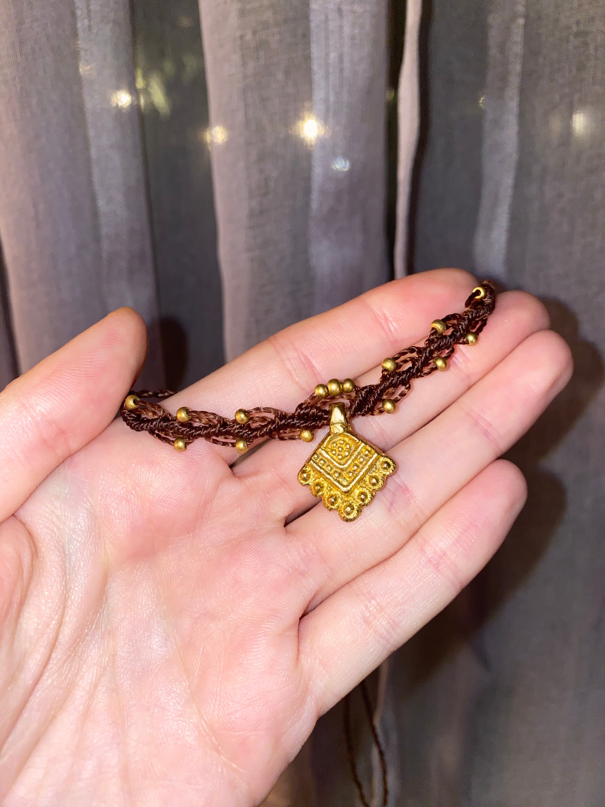Girocollo realizzato in macramè con filo cerato e perle in ottone color oro
