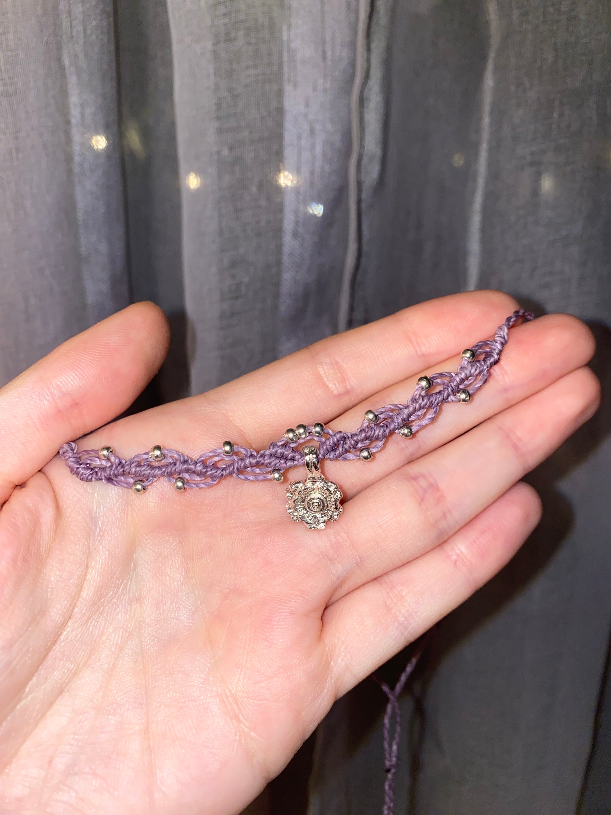 Girocollo realizzato in macramè con filo cerato e perle in ottone color argento