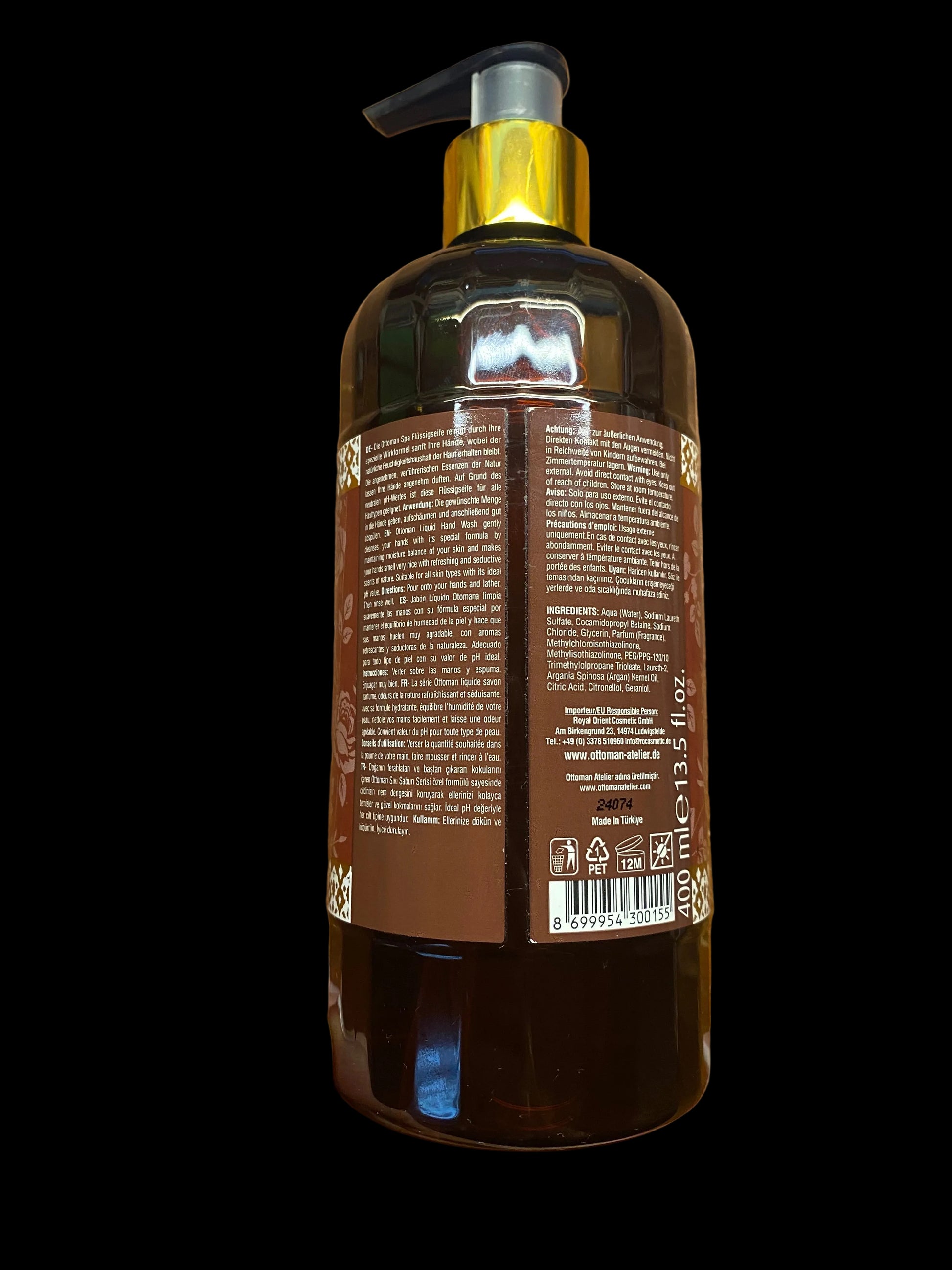 Il sapone liquido Ottoman Argan Spa deterge delicatamente le mani grazie alla sua speciale formula efficace, mantenendo il naturale equilibrio di idratazione della pelle.